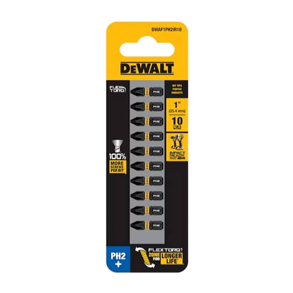 Las Puntas Phillips de Impacto PH2 Dewalt DWAF1PH2IR10 son herramientas de alta calidad diseñadas para trabajos de atornillado con alto torque, típicos en tareas de construcción y montaje.
